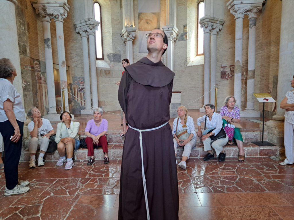 A kirándulók útja ezután a ferences rendház felé vezetett. Az esztergomi közösség különlegessége, hogy egy épületen belül található a rendház, az idősek otthona és a fiú kollégium és gimnázium, a templommal összekötve. Lengyel Donát OFM a rendházban elfogyasztott közös ebéd után a kirándulókat a templomba invitálta, ahol az épület és a ferencesek történetéről is mesélt. A kitűnő időjárásnak köszönhetően ezután lehetőség nyílt egy sétára a Széchényi téren, amit Jeremiás testvér vezetett. A séta közös kávézással és fagyizással ért véget.